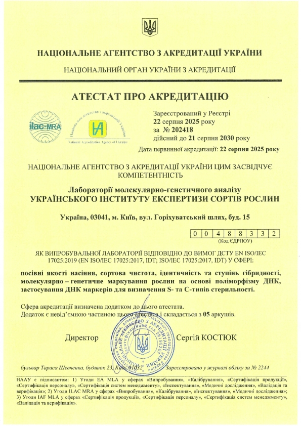 Лабораторія акредитована як випробувальна лабораторія відповідно до вимог ДСТУ EN ISO/IEC 17025:2019 (EN ISO/IEC 17025:2017, IDT; ISO/IEC 17025:2017, IDT) у сфері: посівні якості насіння, сортова чистота, ідентичність та ступінь гібридності, молекулярно-генетичне маркування рослин на основі поліморфізму ДНК, застосування ДНК маркерів для визначення S- та С-типів стерильності.