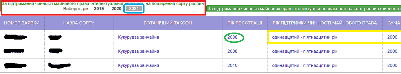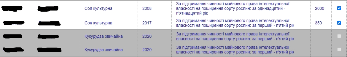 1) За підтримання чинності майнового права інтелектуальної власності на поширення сорту рослин – (Рис. 3)– відображено сорти заявника, що містяться в рестрі на поширення;