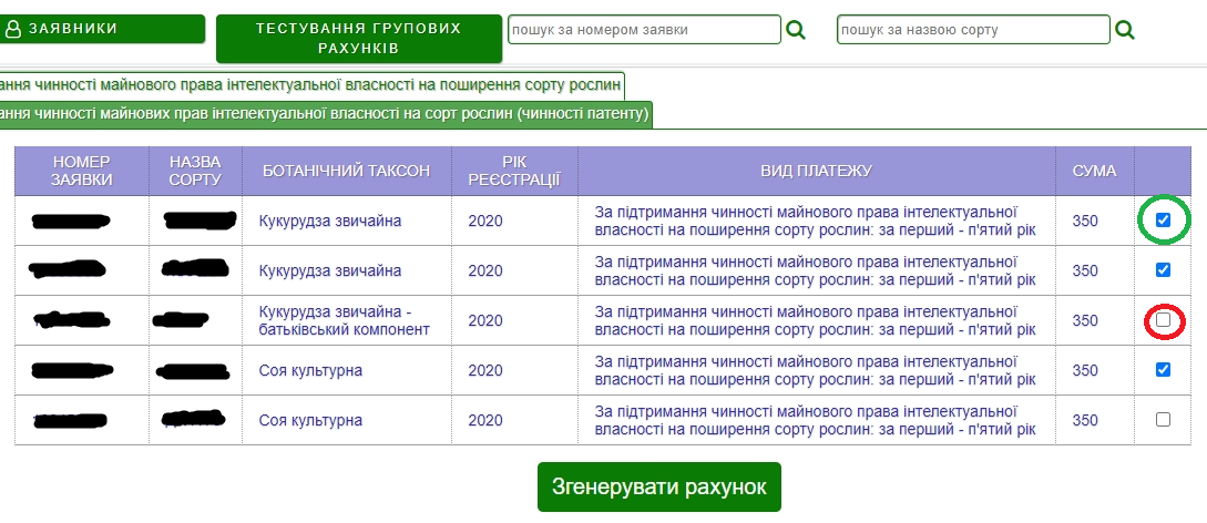 На сторінці сортів обраного заявника відображеться кнопка «ЗГЕНЕРУВАТИ РАХУНОК ЗА ПІДТРИМКУ СОРТІВ» (виділено червоним на Рис. 2). Натискання на дану кнопку дозволить перейти до вибору сортів за підтримку (рис. 3).