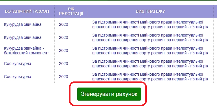 Після вибору сортів, для генерації повідомлення/рахунку на сплату по відповідній підтримці в реєстрі, необхідно натиснути на кнопку «Згенерувати рахунок» (рис. 7) (знаходиться в кінці сторінки). Після натискання якої буде сформовано та завантажено повідомлення в форматі pdf.