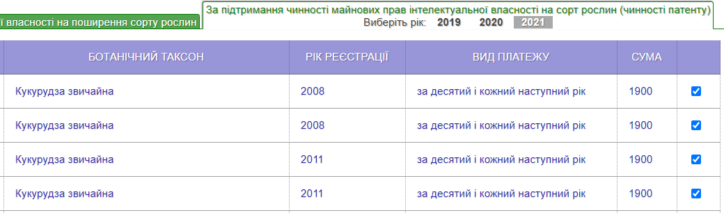 2) За підтримання чинності майнових прав інтелектуальної власності на сорт рослин (чинності патенту) – (Рис. 4)– відображено сорти заявника, що містяться в реєстрі на чинність патенту.