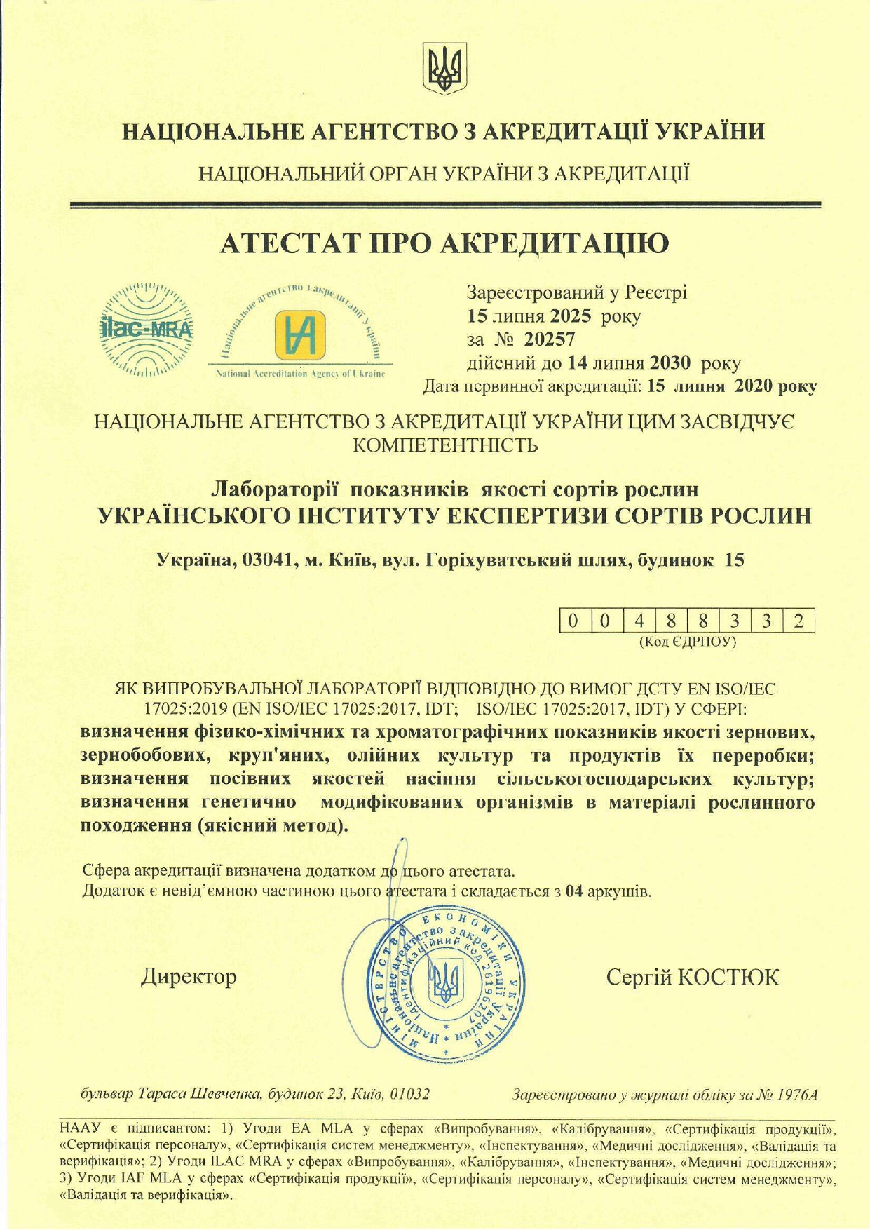 Лабораторія показників якості сортів рослин акредитована на відповідність вимогам ДСТУ EN ISO/IEC 17025:2019 «Загальні вимоги до компетентності випробувальних та калібрувальних лабораторій», національним агентством з акредитації України. Пройшла нагляд на місці та повторну оцінку лабораторії акредитованої на відповідність вимогам.