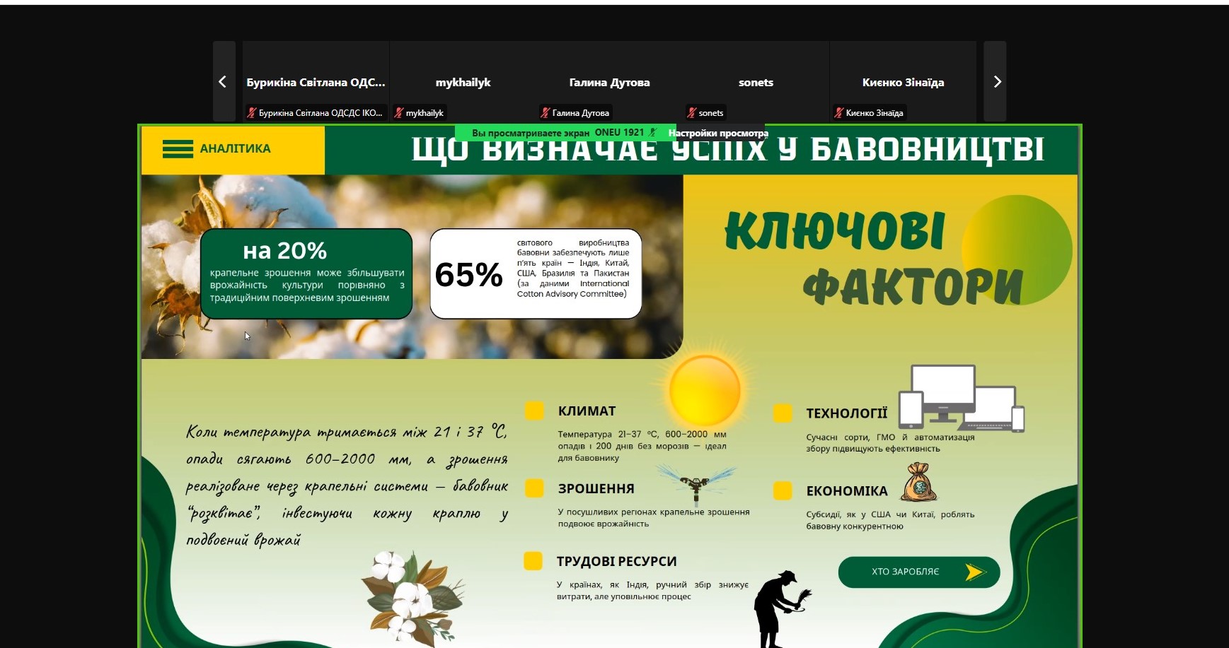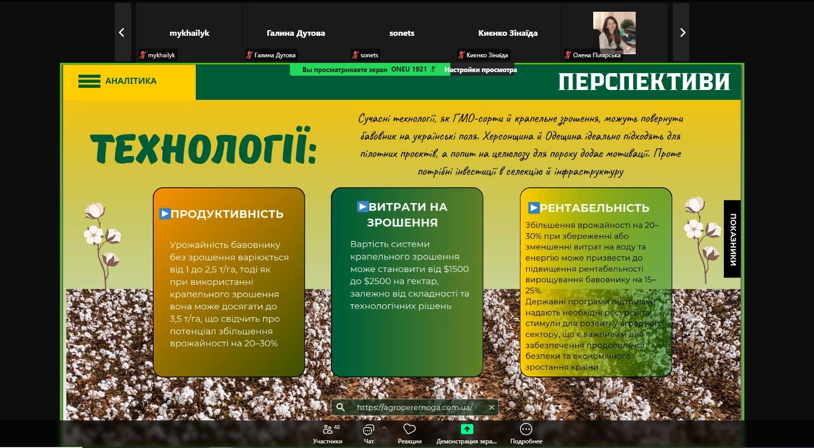 Під час конференції обговорювалися питання селекції, технологій вирощування, кліматичної адаптації, економічної ефективності та перспектив розвитку технічних культур, зокрема бавовнику, в умовах України.