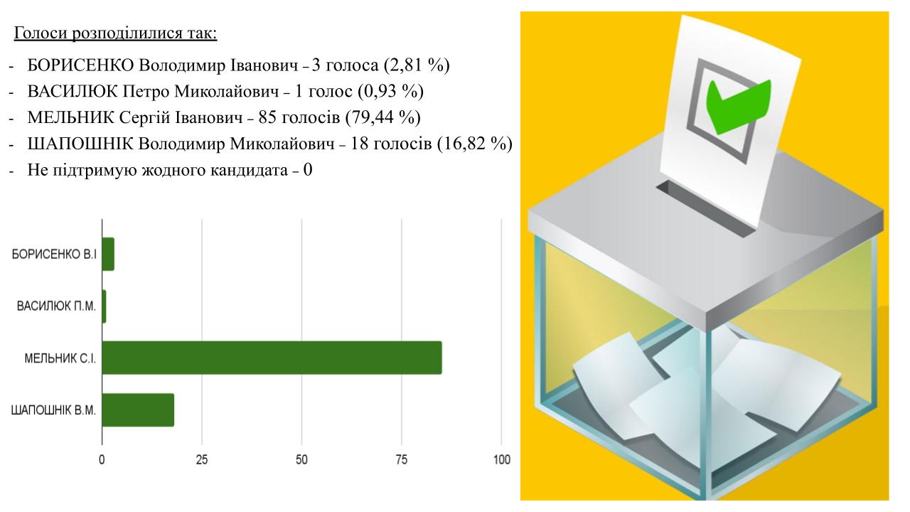 Переважною більшістю голосів переможцем виборів визнано МЕЛЬНИКА Сергія Івановича!