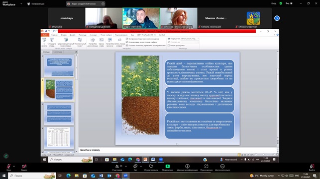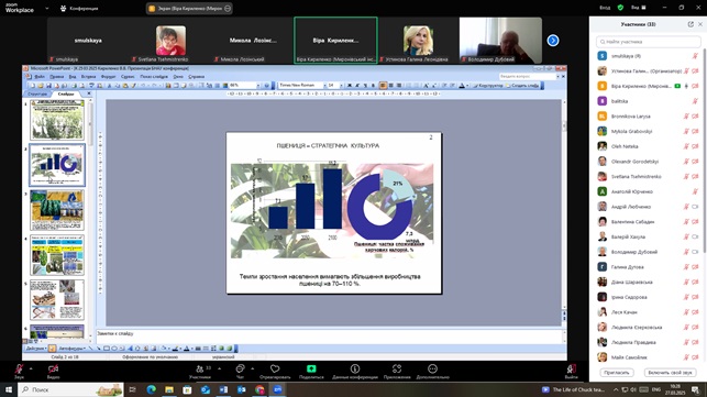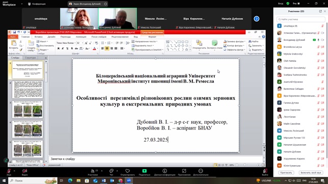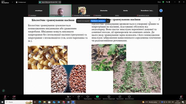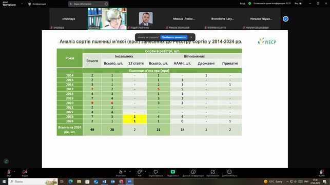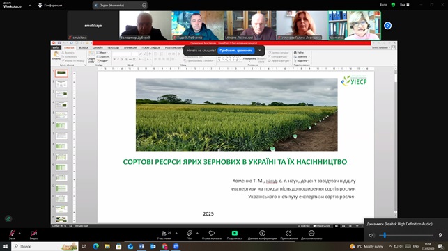 Повернутись27 березня 2025 року працівники Українського інституту експертизи сортів рослин (УІЕСР) взяли активну участь у Міжнародній науково-практичній конференції присвяченій видатним вченим Васильківському С. П. і Молоцькому М. Я. – засновникам наукової школи з селекції та насінництва пшениці і картоплі «Аграрна освіта і наука: досягнення та перспективи розвитку». У ході конференції науковці УІЕСР ознайомилися з результатами наукових досліджень науковців: Білоцерківського національного аграрного університету, Миронівського інституту пшениці імені В. М. Ремесла, Уманського національного університету садівництва, УІЕСР, Одеського національного технологічного університету тощо. Під час конференції обговорювались такі актуальні питання: діагностика стану перезимівлі сортів пшениці озимої в 2025 році в умовах НВЦ БНАУ, травмоощадні технології в обладнанні для транспортування зернових культур, урожайності рижію ярого залежно від норми висіву та ширини міжряддя в Правобережному Лісостепу України, сортові ресурси ярих зернових в Україні та їх насінництво, захист картоплі від шкідників і хвороб, тенденції розвитку овочівництва в Україні під час війни тощо. Науковці УІЕСР прийняли активну участь в обговоренні результатів досліджень та обміні науковою інформацією.