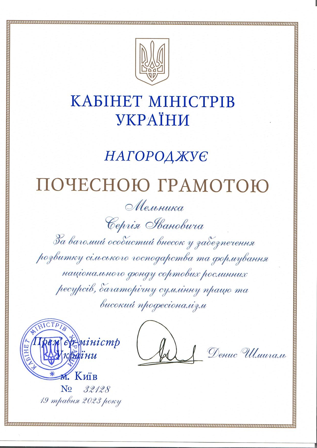 ПовернутисьСьогодні перший заступник Міністра аграрної політики та продовольства України ВИСОЦЬКИЙ Тарас Миколайович привітав директора Українського інституту експертизи сортів рослин МЕЛЬНИКА Сергія Івановича з ювілеєм та вручив Почесну грамоту Кабінету Міністрів України за вагомий особистий внесок у забезпечення розвитку сільського господарства та формування національного фонду сортових рослинних ресурсів, багаторічну сумлінну працю та високий професіоналізм.