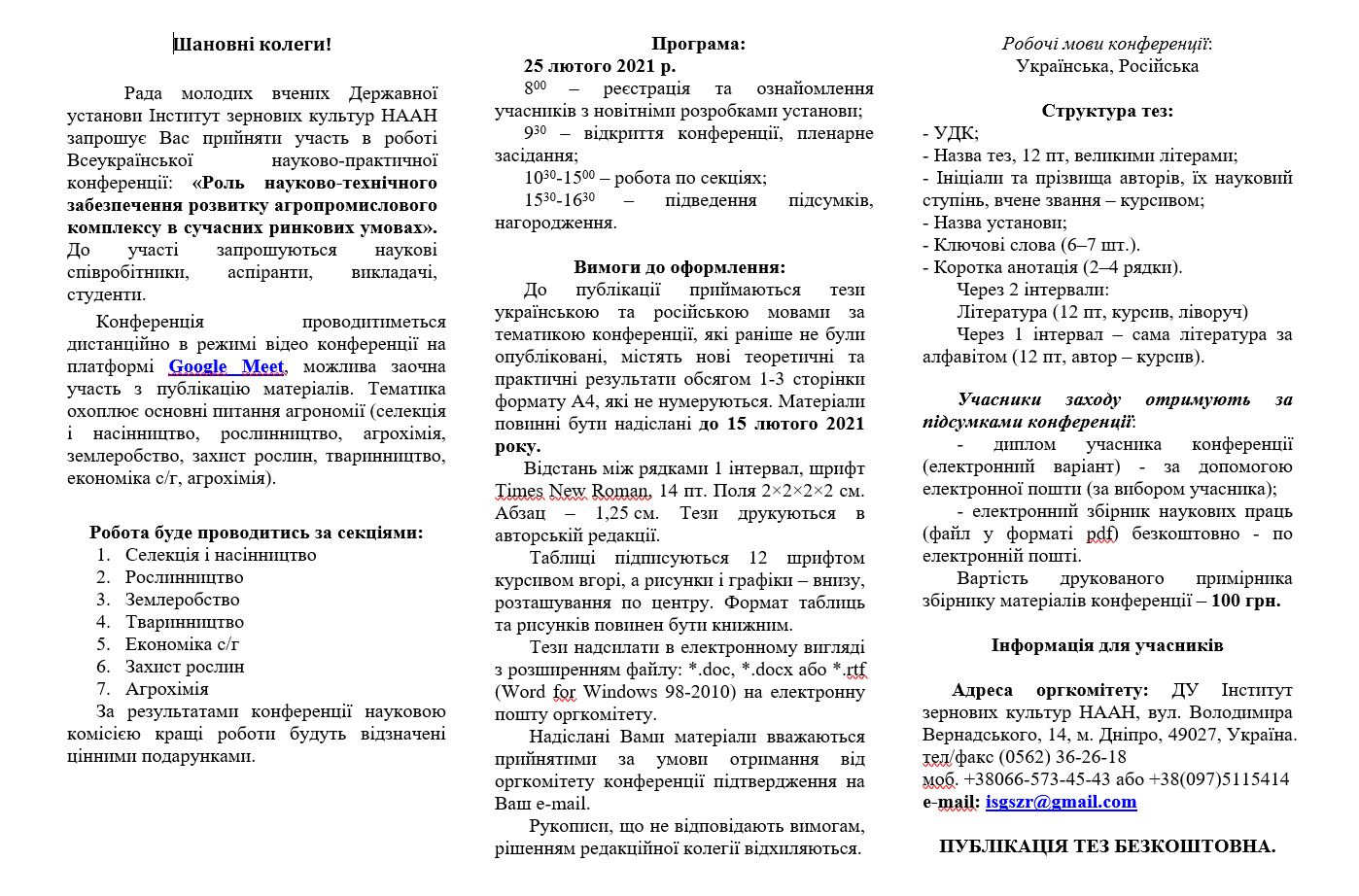 Конференція відбудеться 25 лютого 2021 року дистанційно в режимі відео конференції на платформі Google Meet на базі ДУ Інститут зернових культу НААН (м. Дніпро).